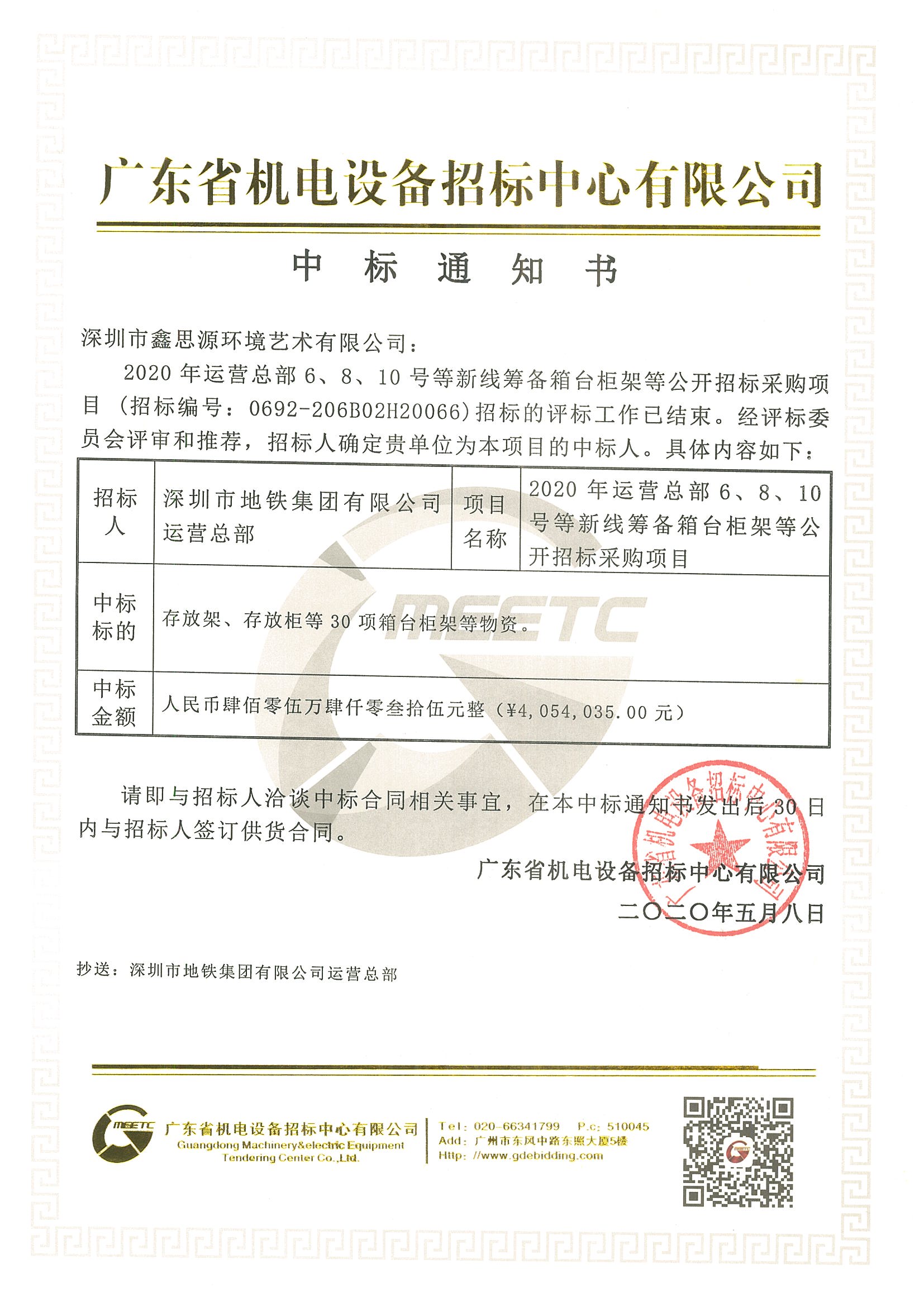 深圳市地鐵集團有限公司辦公家具采購中標通知書